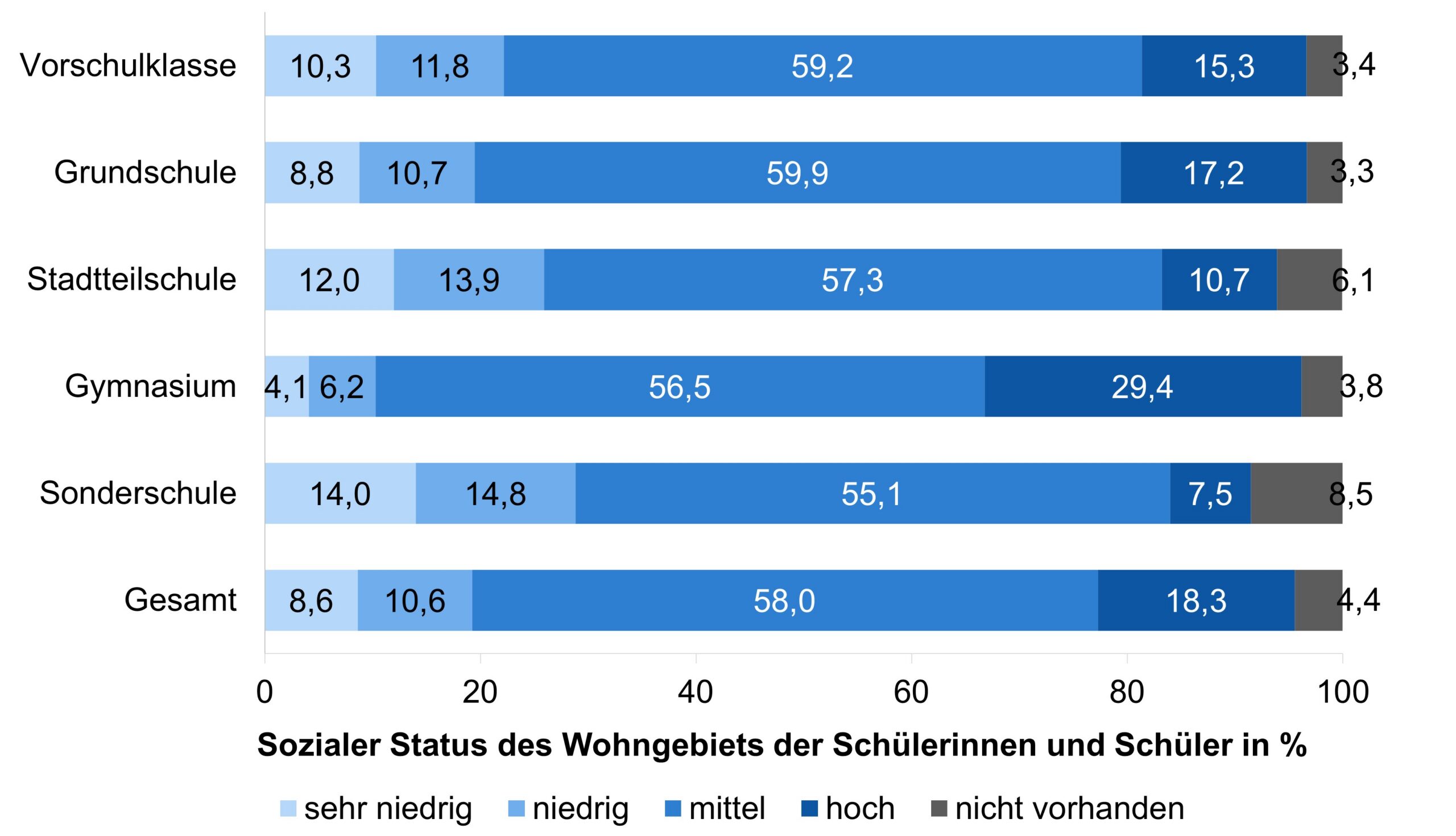 - Gymnasien haben eine sozial ausgelesene Schülerschaft. Mehr als ein Viertel ihrer Schülerinnen und Schüler stammen aus Wohngebieten mit hohem Sozialstatus und nur rund elf Prozent wohnen in Gebieten mit niedrigem oder sehr niedrigem sozialen Status. An Stadtteilschulen ist es in etwa umgekehrt.