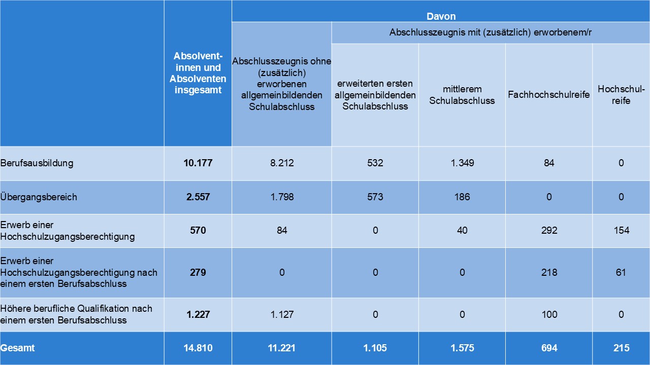 Erläuterung: Staatliche und private Schulen. Die Bildungsgänge sind wie folgt gruppiert: Bildungsgänge, die zu einer Berufsausbildung führen: Berufsschule, vollqualifizierende Berufsfachschule, Berufsqualifizierung. Bildungsgänge im Übergangsbereich: Berufsvorbereitungsschule. Bildungsgänge, die zu einer Hochschulzugangsberechtigung führen: Berufliches Gymnasium, Höhere Handelsschule, Höhere Technikschule. Bildungsgänge, die nach einem ersten Berufsabschluss zu einer Hochschulzugangsberechtigung führen: Fachoberschule, Berufsoberschule. Bildungsgänge, die nach einem ersten Berufsabschluss zu einer höheren beruflichen Qualifikation führen: Fachschule. Der erfolgreiche Abschluss der Berufsschule und der Berufsfachschule (mit Ausnahme der Berufsqualifizierung) ist mindestens dem erweiterten ersten allgemeinbildenden Schulabschluss gleichwertig. Zu den Absolventinnen und Absolventen mit mittlerem Schulabschluss zählen auch 40 Personen, die den schulischen Teil der Fachhochschulreife absolviert haben