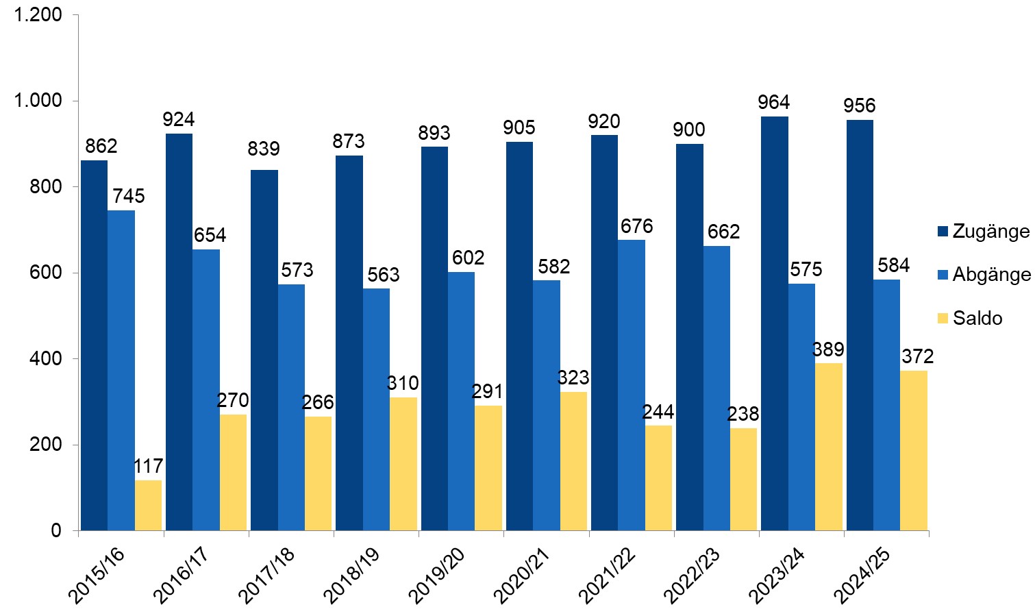 - Im Schuljahr 2024/25 wurden 956 Lehrerinnen und Lehrer neu eingestellt und 584 haben den Schuldienst verlassen.