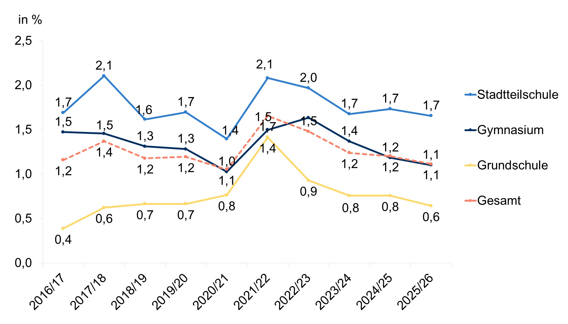 - An Stadtteilschulen wiederholen im aktuellen Schuljahr 1,7 Prozent aller Schülerinnen und Schüler; im Schuljahr 2022/23 waren es noch 2,0 Prozent.