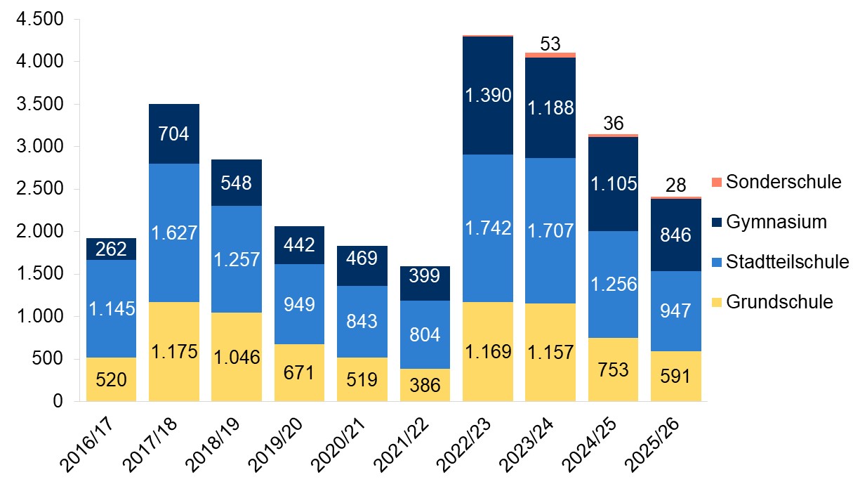 - Bei den weiterführenden Schulen nehmen die Stadtteilschulen durchgängig mehr Schülerinnen und Schüler auf als die Gymnasien. Allerdings ist der Anteil der Schülerinnen und Schüler in Basisklassen und Internationalen Vorbereitungsklassen an Gymnasien in den letzten drei Schuljahren deutlich größer als in den Vorjahren und nähert sich zum Schuljahr 2024/25 fast dem Anteil an Stadtteilschulen an.