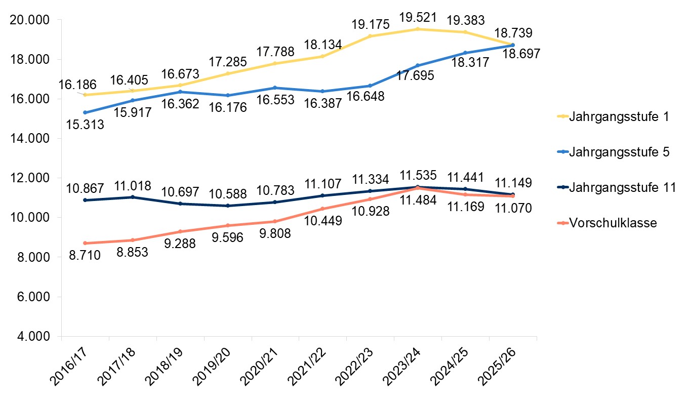 • Alle Schülerinnen und Schüler durchlaufen die Jahrgangsstufen 1 und 5. Die Zahl der Schülerinnen und Schüler in diesen Jahrgangsstufen zeigt demnach nur an, wie viele Schülerinnen und Schüler des entsprechenden Alters in Hamburg leben. Beim Besuch der Vorschulklasse und beim Übergang in die Oberstufe spielen neben der Größe der jeweiligen Altersjahrgänge auch Wahlentscheidungen eine Rolle.