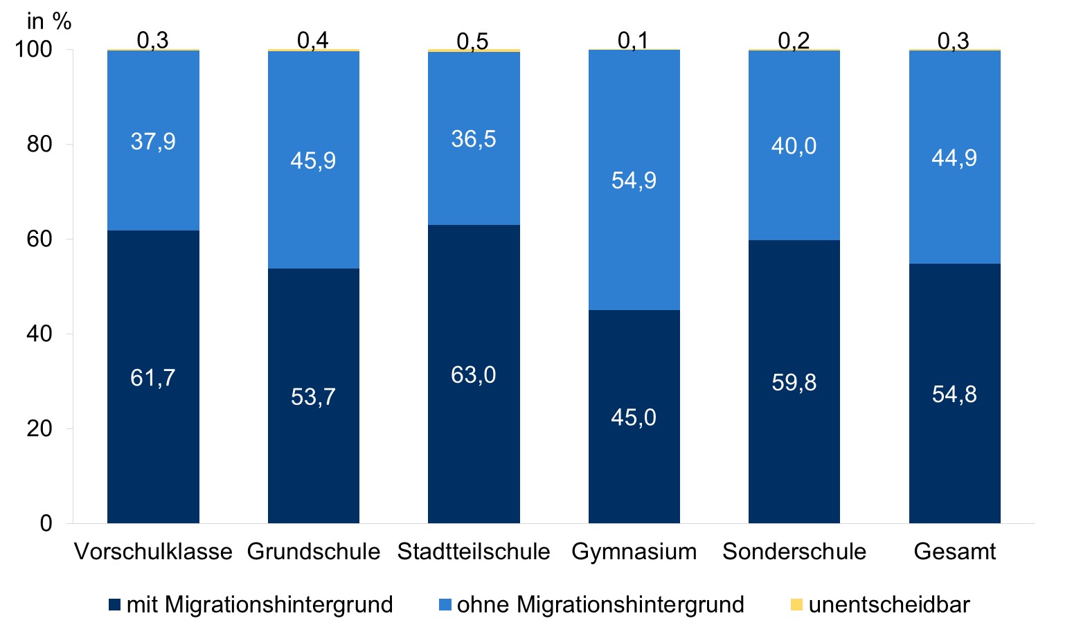 - Besonders hoch sind die Anteile an Kindern mit Migrationshintergrund in Vorschulklassen sowie in Stadtteilschulen.
