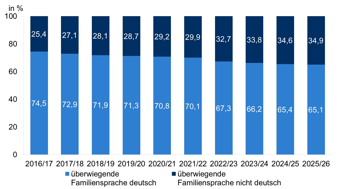 Erläuterung: Staatliche und private Schulen. Berücksichtigt sind die Jahrgangsstufen bis Jahrgangsstufe 10. Ohne Erwachsenenbildung. Ohne berufliche Bildungsgänge an Sonderschulen. Die Familiensprache wird im Anmeldebogen der Schule als „überwiegend in der Familie gesprochene Sprache“ erfasst.