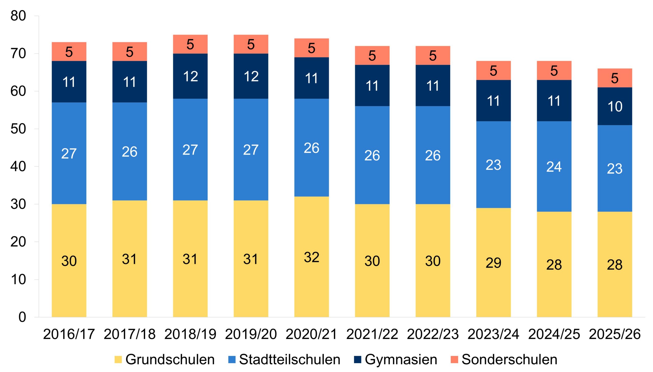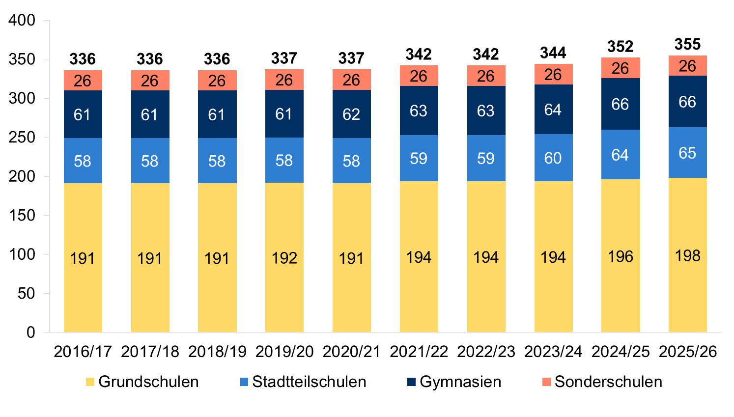 - Es gibt 226 Grundschulen, 88 Stadtteilschulen, 76 Gymnasien und 31 Sonderschulen.