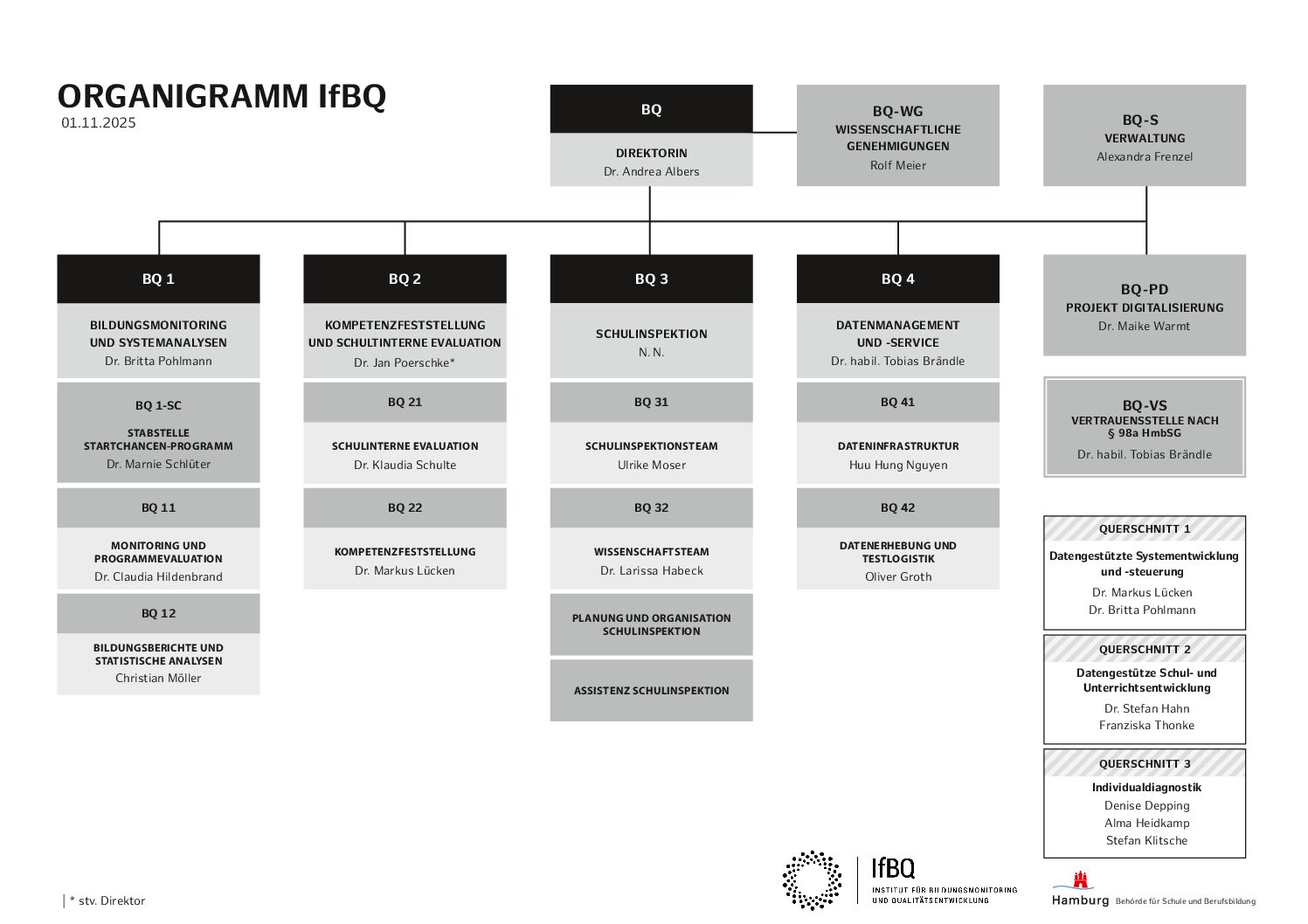 Unser Organigramm bietet Ihnen einen Überblick über die interne Struktur des IfBQ. Die Mitarbeitenden sind in verschiedenen Abteilungen (BQ 1, BQ 2, BQ 3 und BQ 4), Referaten (BQ 11, BQ 12, BQ 21, BQ 22, BQ 31, BQ 32, BQ 41, BQ 42) und Stabsstellen (BQ-WG, BQ-S, BQ-PD) organisiert. Zusätzlich ist die Vertrauensstelle nach § 98a HmbSG am IfBQ angesiedelt.